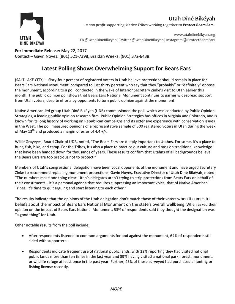 Native American-led group Utah Diné Bikéyah (UDB) commissioned the poll, which was conducted by Public Opinion Strategies, a leading public opinion research firm. Public Opinion Strategies has offices in Virginia and Colorado, and is known for its long history of working on Republican campaigns and its extensive experience with conservation issues in the West. The poll measured opinions of a representative sample of 500 registered voters in Utah during the week of May 13th and produced a margin of error of 4.4 +/-. Over the past 9 days, 58,000 people have uploaded comments to the Department of Interior that are approximately 100 to 1 in favor of keeping Bears Ears National Monument intact. Utah Diné Bikéyah urges supporters to submit comments to the Department of the Interior prior to the May 26th deadline at: www.utahdinebikeyah.org/public-comment