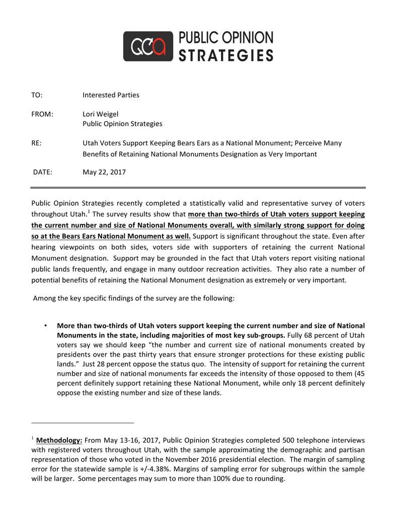 (SALT LAKE CITY)— Sixty-four percent of registered voters in Utah believe protections should remain in place for Bears Ears National Monument, compared to just thirty percent who say that they “probably” or “definitely” oppose the monument, according to a poll conducted in the wake of Interior Secretary Zinke’s visit to Utah earlier this month. The public opinion poll shows that Bears Ears National Monument continues to garner widespread support from Utah voters, despite efforts by opponents to turn public opinion against the monument.