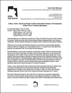President Barack Obama has made history by proclaiming Bears Ears National Monument on December 28, 2016. UDB applauds President Obama’s action, which comes in response to a historic unity of Tribes who together requested permanent protection for the Bears Ears cultural landscape. This victory marks the first time in history that Native American Tribes have called for and succeeded in protecting their sacred ancestral homelands through National Monument designation by a President of the United States of America. “I am deeply delighted that the Bears Ears National Monument is now one of the nation’s greatest treasures for all people and future generations to enjoy,” stated UDB Board Chairman Willie Grayeyes, adding, “I would also like to express my appreciation to President Obama for hearing our voice and listening to the grassroots people, the unity of tribal governments, and all other supporters who stood by us on this powerful path to healing.”
