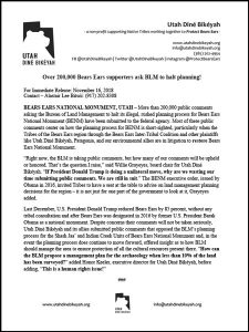 BEARS EARS NATIONAL MONUMENT, UTAH– More than 200,000 public comments asking the Bureau of Land Management to halt its illegal, rushed planning process for Bears Ears National Monument (BENM) have been submitted to the federal agency. Most of these public comments center on how the planning process for BENM is short-sighted, particularly when the Tribes of the Bears Ears region through the Bears Ears Inter-Tribal Coalition and other plaintiffs like Utah Diné Bikéyah, Patagonia, and our environmental allies are in litigation to restoreBears Ears National Monument.