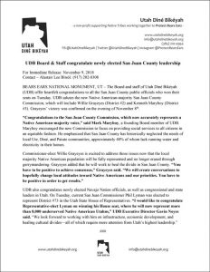 UDB also congratulates newly elected Navajo Nation officials, as well as congressional and state leaders in Utah. On Tuesday, current San Juan Commissioner Phil Lyman was elected to represent District #73 in the Utah State House of Representatives. “I would like to congratulate Representative-elect Lyman on winning his House seat, where he will now represent more than 8,000 underserved Native American Utahns,” UDB Executive Director Gavin Noyes said. “We look forward to working with him on infrastructure, economic development, and healing cultural divides—all of which require more attention from Utah’s highest leadership.”