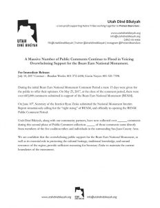 After a record-breaking initial comment period, UDB collected more than 2,200 additional public comments in support of Bears Ears National Monument during the secondary period that concluded July 10. Public comments continue to reflect the strong local Native American majority that favors the existing boundary and Monument protection for the Bears Ears cultural landscape. Statistical analysis demonstrates 98% of all comments received by the Department of Interior support keeping or expanding National Monument designations.
